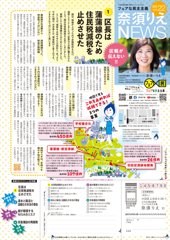 ◆区政報告会 令和8年度予算や第一回定例会で審議した議案を中心に 最近の区政についてご報告いたします。 場所:大田区消費者生活センター 参加費:無料 *参加ご希望の方は事前にご連絡ください。 -