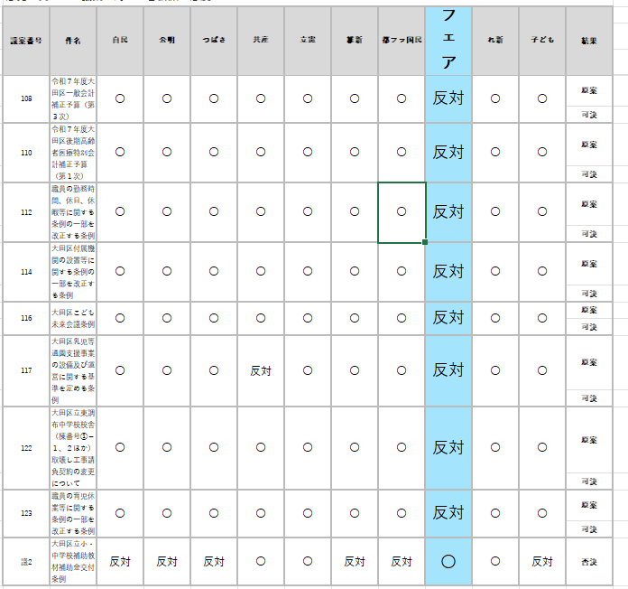 令和7年第三回定例会 意見の分かれた議案と会派ごと態度一覧と奈須りえの賛否の理由