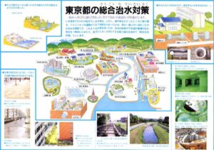 「いま東京でたびたび起きている水害は、むかし、畑や林などだったところに家が建ち、アスファルトの道路が出来て地面をおおったため、雨が一度に川へ流れ込むのがおもな原因です。このような水害を防ぐため、河川の改修や下水道の整備のほか、雨水を一時的にためたり、地下にしみこませたりする取り組みを含めて総合治水対策といいます。」
