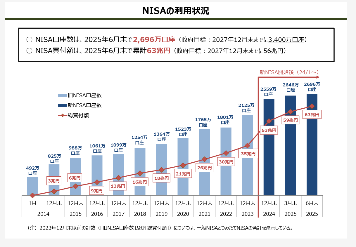 2024年末に53兆円だったNISA残高は、新NISA開始後2025年6月末63兆円と、6か月で、10兆円も増えています。